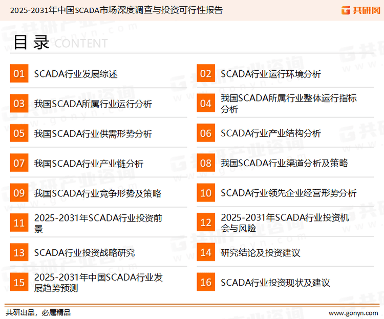 共研产业研究院通过对公开信息分析、业内资深人士和相关企业高管的深度访谈,以及分析师专业性判断和评价撰写了《2025-2031年中国SCADA市场深度调查与投资可行性报告》。本报告为SCADA企业决策人及投资者提供了重要参考依据。