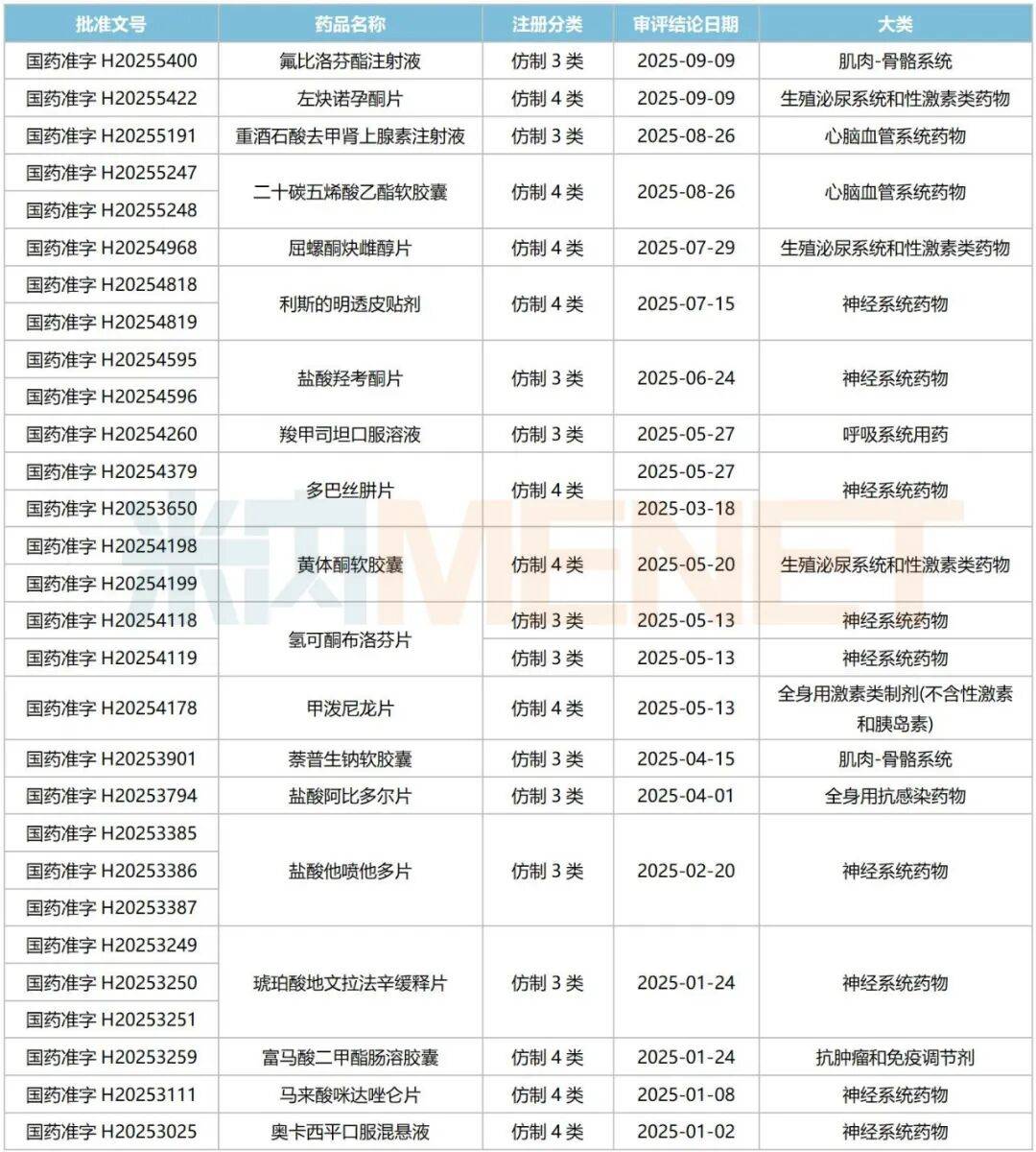 19个品种中,有多个品种为国内首批获批,其中盐酸他喷他多片、萘普生钠软胶囊、氢可酮布洛芬片为国内首仿+首家过评,马来酸片、琥珀酸地文拉法辛缓释片、盐酸羟考酮片、屈螺酮炔雌醇片国产第2家获批,奥卡西平口服混悬液、富马酸二甲酯肠溶胶囊、利斯的明透皮贴剂国产第3家获批等。