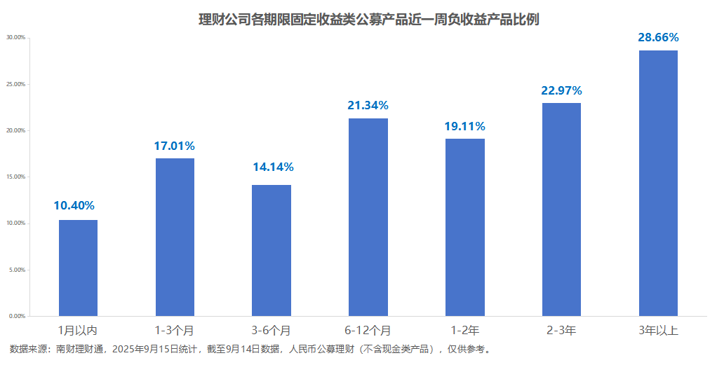南财理财通数据显示,固定收益类理财中,3年以上期限近一周负收益产品占比最高,为28.66%。1个月以内期限负收益产品数量占比最低,为10.4%。