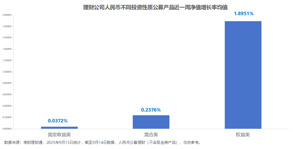 破净产品数量维持在低位。南财理财通数据显示,截至2025年9月14日,理财公司共有26,141只存续公募理财产品,其中246只累计净值低于1,银行理财综合破净率为0.94%。权益类、混合类理财破净率分别为20.45%和3.51%,固定收益类公募理财破净率为0.78%。