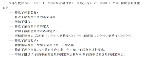 :2021年3月11日,国家标准化管理委员会发布“2021年第3号中国国家标准公告”,GB/T10781.1-2021《白酒质量要求 第1部分:浓香型白酒》国家标准正式发布,本标准代替GB/T 10781.1-2006《浓香型白酒》,实施日期为2022年4月1日。本次修订是本标准的第三次修订。
