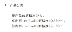 以40%vol为分界,将产品分为高度酒和低度酒,同时解决原标准中高低度酒界限模糊的问题 。