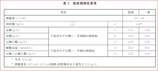 白酒产品在出厂后一段时间,酸酯发生可逆平衡反应,为反映这一客观规律,除酒精度和固形物外,本标准按产品生产日期1年内(含1年)和1年后分别提出要求,这也是首次在国家标准中以理化指标方式明确表达出我国传统白酒具有动态的生命力,并且与原标准总酸和总酯折算后相比,提高了酸酯总量的要求。