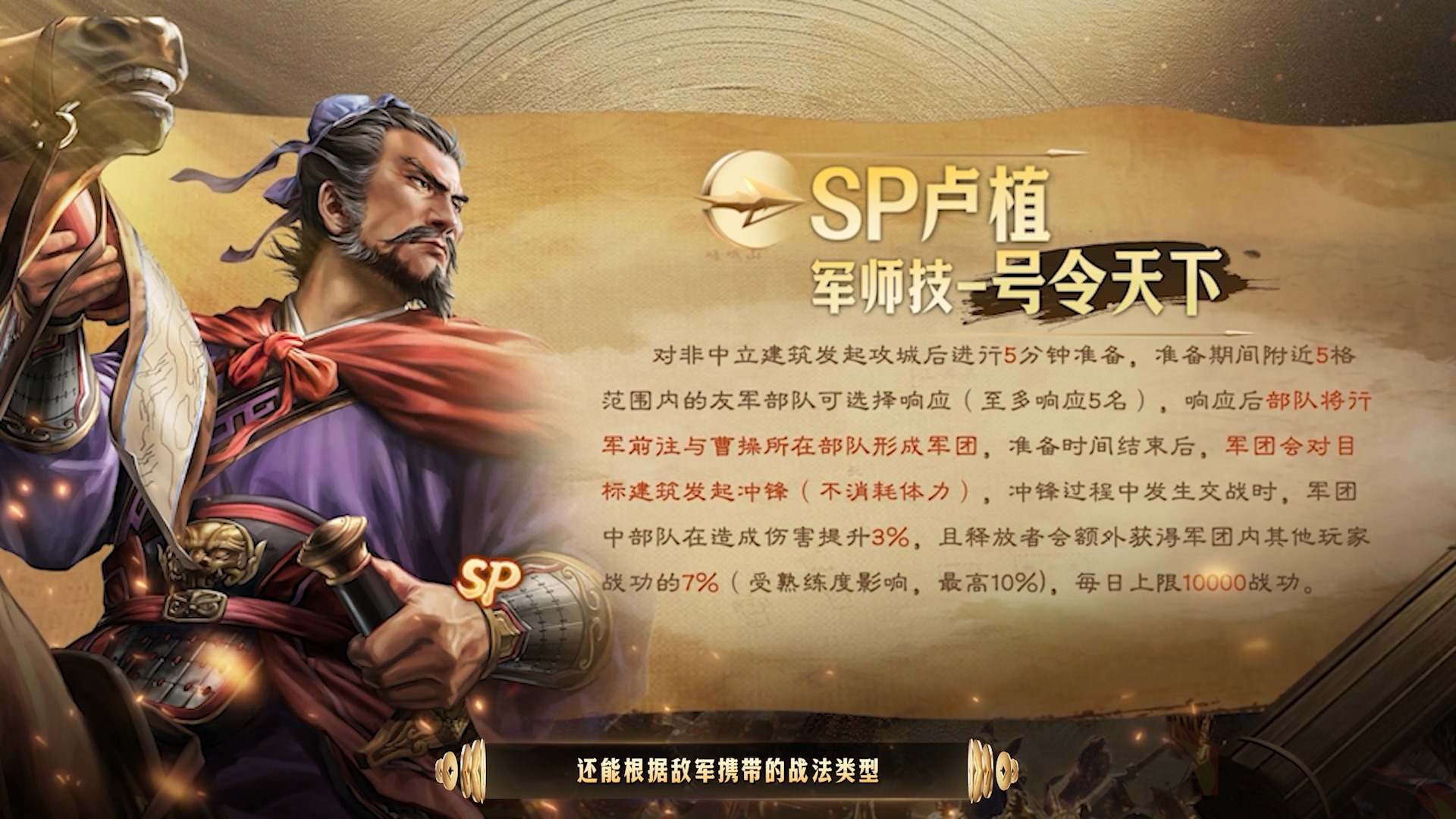 制作团队对三国历史的较真考究和对三国文化的热爱尊崇,给玩家和业内都留下了深刻印象,游戏内融入的丰富三国元素最为明显。这次六周年庆将要推出的全新武将SP卢植,历史上是刘备和公孙瓒的老师,是一位文武双全的清流名士。他的技能设计也结合了人物特点,自带战法可为全队提供高额统率、倒戈与攻心效果,并能根据敌军所携战法类型,为我军群体提供大量兵刃减伤。