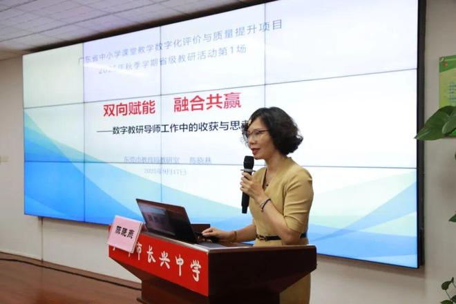 活动设置多场专题分享环节,聚焦数字教研实践与教师成长。东莞市教育局教研室教研员陈晓燕以《双向赋能,融合共赢——数字教研导师工作中的收获与思考》为题,阐述数字教研导师的角色要求、必备素养及教研员与导师身份的双向赋能价值,并建议参与单位与教师充分运用工具赋能教学教研。